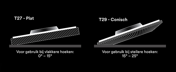 De lamellenschijven zijn verkrijgbaar in twee vormen: conisch en plat. De keuze is afhankelijk van uw toepassing. Kies de vorm waarbij de volledige breedte van de schuurlamellen contact maakt met het werkstuk voor een zo lang mogelijke levensduur van de schijf.